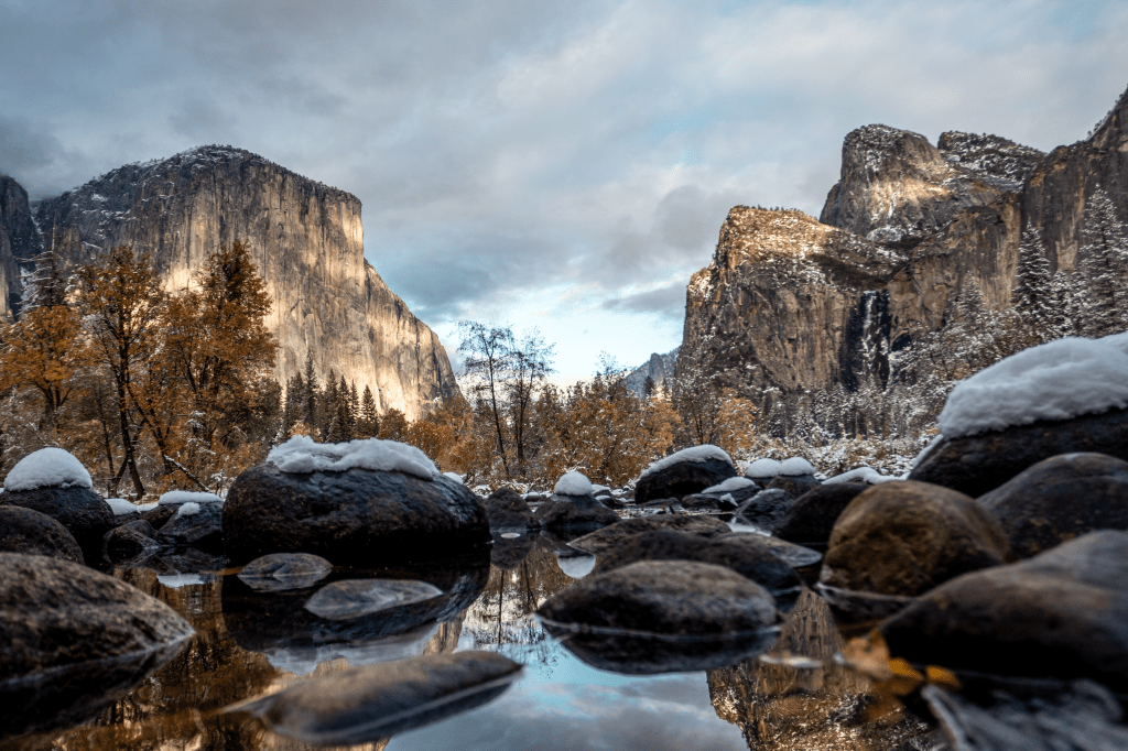 We stayed at Yosemite Lakes RV Resort, which was located about ten miles outside of the park. We’ve found it to be difficult to secure a reservation in any National Park at this time of year, given the limited space and lack of employees. Yosemite lakes was a great place to stay and our neighbors were so friendly. The first morning we unexpectedly woke up to a winter wonderland, which was much more exciting when we stepped outside to learn the kids next door had never seen snow. They walked along the steps of their picnic table, kicking the snow off while catching it in their hands as it fell from the sky. Their parents told us to knock if we needed anything and even gave us their leftover firewood before they headed home.
