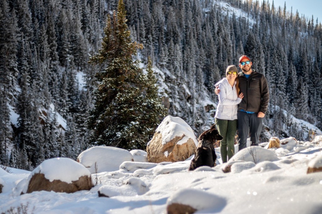 Oakleigh told stories and talked nervously as we continued our way up to Fish Creek Falls. We were surrounded by beautiful aspen trees lining the path which led us to several snow-covered switchbacks and eventually the frozen “Fish Creek Falls”. Oakleigh and Lauren walked toward the scenic falls, as Mike and I backed away carefully, trying not to expel any ounce of excitement too soon. We were lucky enough to witness Oakleigh get down on one knee and ask Lauren to marry him, which she answered almost immediately with a YES.. finally! Mike and I captured the moment from afar on camera and were so thrilled to be able to do so. Lauren jumped up and down like a little kid in excitement and Oakleigh told her, “You can officially start planning now.” They popped champagne and anti-climatically the champagne streamed out the sides of the bottles without making an actual “Popping” noise. Their dog Luna joined in on a few pictures, as did Berkley, without being invited to. After lots of laughs and excitement, we made our way back down the trail to a snow covered bridge where Mike took a few more awesome shots of the newly engaged couple.