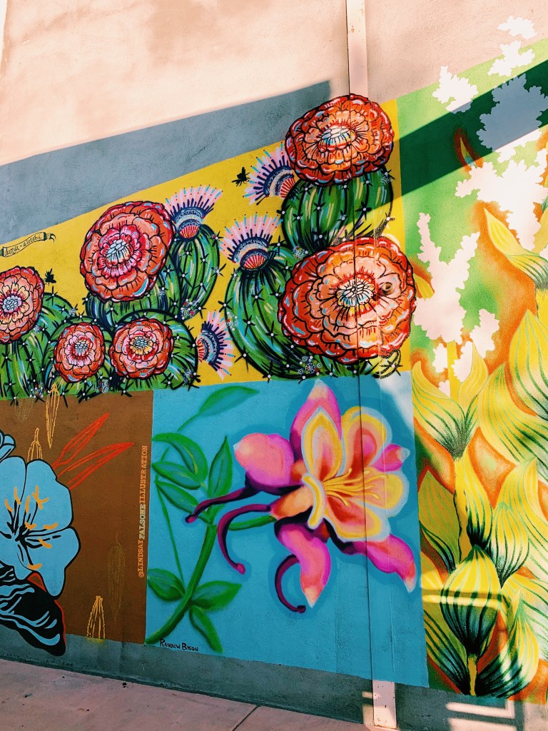 The rest of our hike was gorgeous even though the wind picked up a bit. We admired the colorful vistas and sharp terrain as we made our way back to the parking area. It always feels good to finish a hike together. We feel so blessed to experience all of these amazing places all at once. Before heading back to town, we stopped to admire the rocks in Hidden Valley and wondered if the ranch dressing was made there. Probably not, due to the fact that there’s nothing but giant rocks, some balancing on top of one another, as if a child placed them there that way. The rocks are mesmerizing and seem as if they’re begging you to climb them. We did climb and took a few pictures on top of them. I took Berk man for a long walk through the park beside our campsite, despite the fact that we hiked six miles and I was so sore. If you ever visit, make sure you stop by Coyote Corner after visiting the park. Mike and I both found great books and the vibes in the store were indescribable. We enjoyed a scrumptious dinner at Joshua Tree Saloon and left our mark by adding our Travel the Fernweh sticker on their outdoor sticker wall.