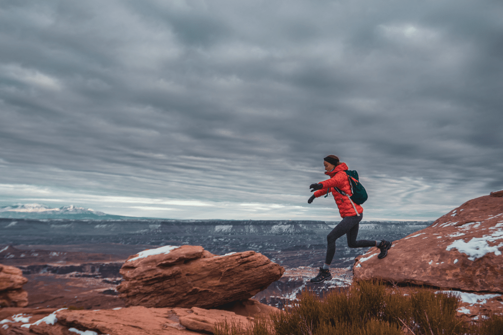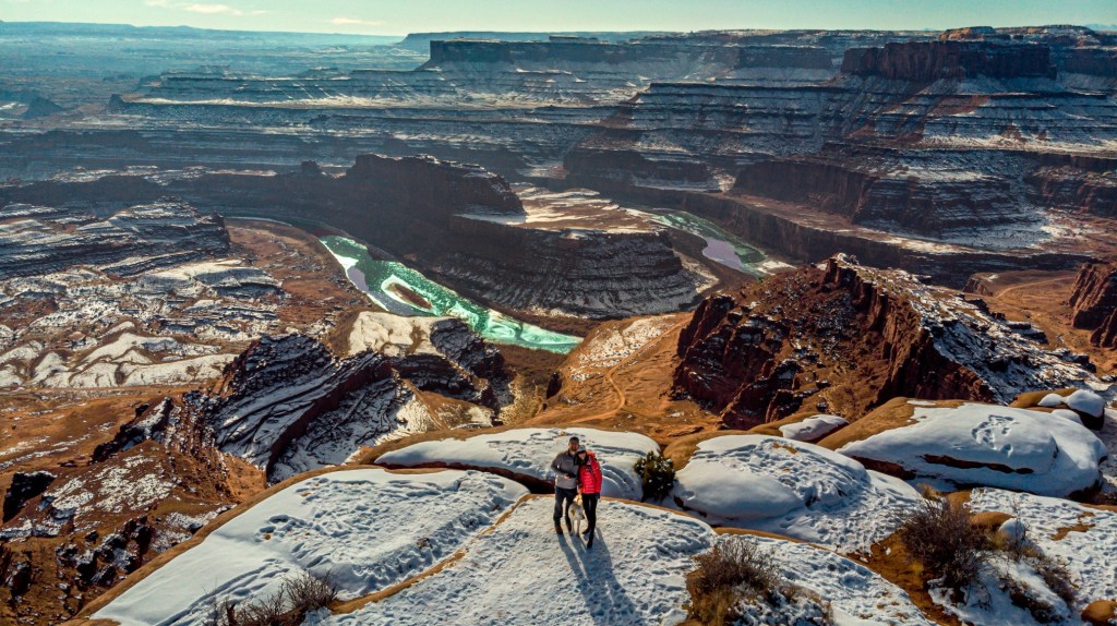 After hearing about the hype of Dead Horse Point State Park, we knew we needed to spend a day seeing what it was all about. The park is located about 30 minutes outside of Moab and is conveniently only six miles from Canyonlands State Park, so even if your time is limited it’s certainly possible to visit both in one day. Our National Parks pass does not include entry into any state parks, so it did cost us $20 for the day (Which was totally worth it). Michael also paid an extra $10 for a one-day drone permit. For the first half of our trip he had forgotten his drone at home, so he was super eager to fly it. The park typically doesn’t allow drones, but because it’s the “Off-season” and there are less people around in the Winter months, they allow them. Another huge perk of visiting Dead Horse Point is that they allow dogs, while almost all of the National Parks do not. Berk was thrilled to spend the entire day hiking with us. We liked it so much, we came back a day later to ride the Intrepid, raven run and Great Pyramid mountain biking trails, which offered completely different views from the hiking trails, so we’d suggest doing both if you have the time.