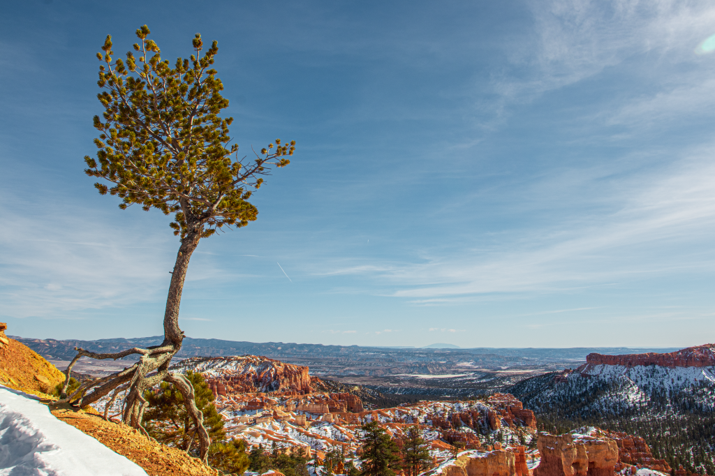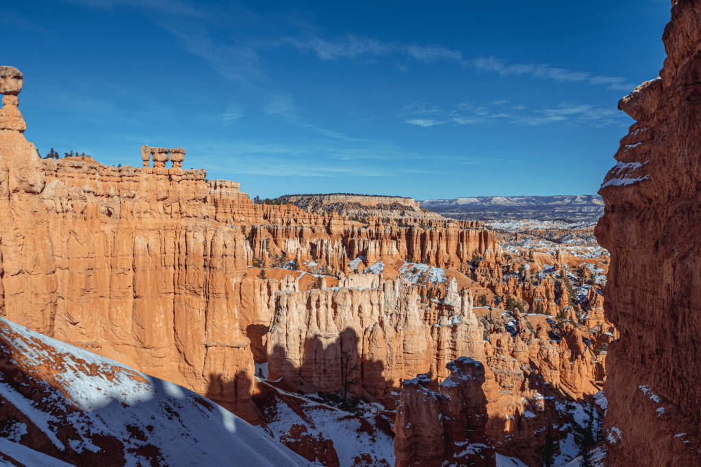 We left Torrey, Utah eager to see Bryce Canyon and excited to put the cold winds behind us. We drove two hours Southeast from Capitol Reef to Bryce Canyon. When we arrived we hiked the Navajo Loop Trail, which was stunning and one we’d 100% recommend. Definitely recommend beginning at “Sunrise Point” and ending at “Sunset Point.” The hike was downright spectacular. The buttes, spire’s and hoodoo’s surrounded the narrow, snow covered path and made me feel like I was in a Disney attraction. It just didn’t seem real. The salmon colored rocks and castle-like spires seemed like they were pulled right out of a fairytale movie. It’s such a magical looking place. At the end of the Navajo loop, the view from the switchbacks is photo worthy and will give you a chance to catch your breath.